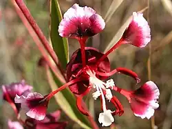 The inflorescence bears open flowers and hanging, closed flower buds. The deep red sepals remain fused together as the petals bloom from one side. Each petal is a diamond-shaped blade at the end of a long claw. It is pinkish-lavender with a purple spot at the base. There are 8 stamens, some with large, red anthers and some with smaller, paler anthers. The stigma protrudes from the center.