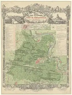In August 1839, Denecourt took advantage of public interest in watching a major military maneuver at the camp of Arbonne (a village in the forest) to publish a booklet that helped visitors to locate the maneuvers in the forest.[3] From then on, this guide[4] would be reissued constantly until his death (11 editions between 1839 and 1848 alone), accompanied by numerous additions. His forest guides, modestly priced so as to be accessible to the masses,[5] accompanied the growth in forest tourism in the 1840s.[1]