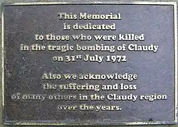 A memorial to those killed and injured by the bombing was erected on Claudy's Main Street in 2000, consisting of a bronze figure of a kneeling girl, created by sculptor Elizabeth McLaughlin, mounted on a stone plinth. A number of plaques commemorating the victims are affixed to the wall enclosing the statue.[21] The statue was damaged on 20 October 2006 when vandals knocked it from the plinth.[22]