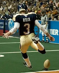 On June 24, 1999, Rush was signed by the Iowa Barnstormers of the Arena Football League (AFL) after the struggling Steve Opstad was released.[13][14] On June 26 in his first game with the Barnstormers, he made a game-winning 21-yard field goal to help Iowa beat the Albany Firebirds by a score of 77–76.[15] He played in five games for the Barnstormers during the 1999 AFL season, converting eight of nine field goals and 34 of 39 extra points.[1][16]