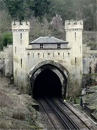 Large octagonal turrets that stand tall in the cutting are either side of the portal. During 1849, these towers were converted for use by the line's signalmen.[3] A further feature of the north portal is its attached single-storey cottage, which is perched directly over the line, which has been described as being one of the more unusual and photogenic railway locations in the UK. This cottage, which is built in contrasting red brick and sits curiously off-centre, was added in 1849 at a cost of £70.[3] It was originally used to house the tunnel's care taker and his family. It is presently a private dwelling as well as being a Grade II listed building, having been designated as such on 11 May 1983.[4][5]