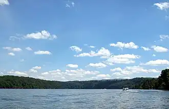 In 1910, the New River Power Company began acquiring land on the New River south of Radford, Virginia for the impoundment for several hydroelectric dam projects.[2] By 1925, these projects had been combined, and control of the project passed to APC.[3] The construction of Development No. 6, later called the Claytor Dam, began in 1937 and was completed in 1939.[4] By the Spring of 1940, the New River was fully impounded, and Claytor Lake was formed.