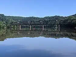 The New River Trail State Park, a rail trail that was built on top of an abandoned Norfolk Southern Railway right-of-way, follows part of the shoreline of Claytor Lake and crosses it on the Hiwassee Bridge. The 951-foot-long (290 m) bridge was built in 1931 by the Virginia Bridge and Iron Co. of Roanoke, a subsidiary of the Norfolk and Western Railway.