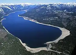 The lake is used as a storage reservoir for the Yakima Project, an irrigation project run by the United States Bureau of Reclamation. Although a natural lake, Cle Elum Lake's capacity and discharge is controlled by Cle Elum Dam, a 165-foot (50 m) high earthfill structure built in 1933. As a storage reservoir, Cle Elum Lake's active capacity is 436,900 acre feet (539,000,000 m³).[2]