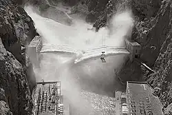 Segerblom's photo "Canyon Wall Outlet Works" records one of the instances when the Bureau of Reclamation offered trolley rides to certain dignitaries to experience the outlet water of the dam release up close. The photo captures a day when, following heavy rains that raised Lake Mead to record levels, water poured through the jet flow valves on each side of the canyon while tiny spectators dangled precariously close to the streams. In Segerblom’s words: "I understand it was the only time all the outlets were open at once. At one point I was on that skip, which was carrying a number of dignitaries. Interior secretary Ickes was on it, as I recall. I took some photos and then got off and ran around on top of the dam."[5] The September 1940 photograph of the dam is his most circulated work,[3] and was exhibited in New York.[7][8]