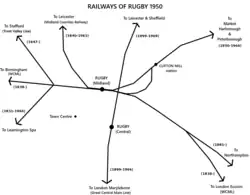 Parliamentary approval was gained in 1846 to the directors of the London and Birmingham Railway for a branch from Rugby to the Syston and Peterborough Railway near Stamford.[3] In the same year the company became part of the London and North Western Railway. The section from Rugby to Market Harborough was opened on 1 May 1850. Clifton Mill did not open until 1864. and [1] although it was single track, it was doubled in 1878.[4]