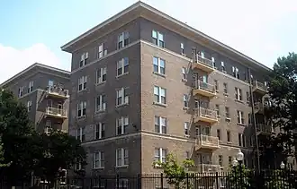 Clifton Terrace are historic structures located in the Columbia Heights neighborhood in the Northwest Quadrant of Washington, D.C. Frank Russell White and Albert Moreland Schneider designed the three building apartment complex in the Colonial Revival style. They were inspired by the garden city movement.[2] Harry Wardman built the complex from 1914–1915 along the 14th Street streetcar line. It was listed on the National Register of Historic Places in 2001.