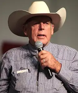 Cliven D. Bundy (born April 29, 1946) is an American cattle rancher known for his role in the 2014 Bundy standoff.[2] Bundy has advocated a philosophy opposed to what he views as federal government overreach. He is the father of Ammon Bundy, who in 2016 also led another armed standoff against the government, the occupation of the Malheur National Wildlife Refuge in Oregon.