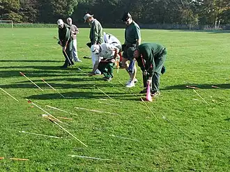 Clout archery is a form of archery in which archers shoot arrows at a flag (known as "the Clout") from a relatively long distance and score points depending on how close each arrow lands to the flag.