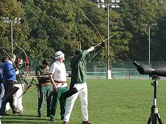- two-way shooting: two shooting lines and two sets of flags are set up. One shooting line and one set of flags is placed at one end of the range; the other shooting line and other set of flags is placed at the other end. The archers shoot from one shooting line towards one set of flags, walk to the flags with their bows to score and collect their arrows, then turn around and shoot towards the other set of flags.