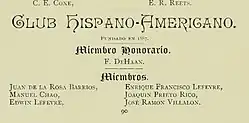 The Club Hispano Americano (Hispanic American Club) is the first known Latin American student organization founded at the collegiate level in the United States. It was founded at Lehigh University in 1887.[1] The club was created by international Latin American students who came to the United States to study before returning to their countries. Most of the members in the Club Hispano Americano were in fraternities. After its creation in 1887, other Latin American students started forming similar clubs throughout the northeast. An example of this is the Club Hispano Americano, founded at Rensselaer Polytechnic Institute (RPI) in 1890, became another organization to serve wealthy international Latin American students.[2] The Club Hispano Americano at RPI became the first Latin American student organization at RPI. Some of its members were also in Anglo fraternities on campus. The Club Hispano Americano served as a foundation for other student groups that would follow its lead into the twentieth century.