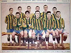 Atlético San Fernando debuted in the 1922 season playing in official league, "Asociación Argentina de Football" (the other league was the dissident "Asociación Amateurs de Football").[2] The colors that identify the club (blue, white and green) symbolized seriousness, purity and hope respectively.