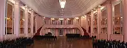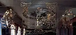 - Third floor: the old Dancing Room, now known as the Crystal Room, features a series of gold-engraved black crystal panels imported from Europe depicting scenes of aristocrats dancing, a large door under a circular frame and a star-embossed ceiling. It also features the Ballroom with a ceiling in the shape of a ribbed ellipsoidal dome, large antique chandeliers, recessed lights, mirrors on the walls and a mezzanine, as well as semicircular nooks and a checkroom.[27]