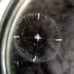 Mature individuals can reach 2 cm in diameter, but rarely reach 1.5 cm. Clytia gregaria's translucent bell is saucer-shaped, with a diameter greater than its height. Positioned close to the bell margin are four radial canals with a white or yellowish elongated gonad in each. On the bell margin are up to 60 highly extensile tentacles of equal length (in mature individuals). The mouth opens directly into the manubrium, which has four ruffled lips and is a pale yellow or brownish color. The manubrium is attached directly to the subumbrella. Sometimes there is a lateral stripe of dark pigment on the bell margin and gonads.[1][2]