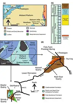 - ^ a b Cherns, Lesley; Cocks, L.R.M; Davies, J.R.; Hillier, R.D.; Waters, R.A.; Williams, M. (2006). Brenchley, P.J; Rawson, P.J. (eds.). The Geology of England and Wales (2 ed.). Geological Society of London. pp. 91–92. ISBN 978-1-86239-200-7.