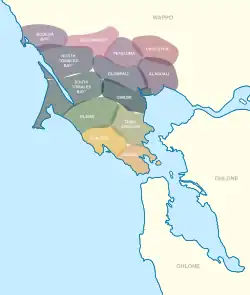 These tribes did not have a political structure and so are not "tribes" in that sense.[12] Rather, chiefs or headmen (oi-bu in Olamentko[13] and hoipu in Hookooeko) were empowered at the tribelet level. The Coast Miwok did not have a single name for all three tribes, describing themselves instead by tribe, tribelet, or village, depending on the context. Using Merriam's divisions, the tribelets as shown on the map to the right – itself derived from Milliken[12] – can be classified as: