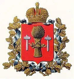 The coat of arms of the Radom Governorate depicted an orange (golden) sheaf of hay, tied up with an orange band, with a silver hammer placed to the left, and to the right, from the hay. They were placed within a blue French-style escutcheon. Around the shield, there are yellow (golden) leaves of the oak tree, interspersed with the blue ribbon of the Order of St. Andrew. On the top of the coat of arms, above the escutcheon, there was the yellow (golden) Imperial Crown of Russia.[6][9]