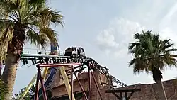 The roller coaster's tubular steel track, which was fabricated in Germany,[51] is 2,100 feet (640 m) long.[43] The track of the roller coaster is green and the supports lining the lift hill are red and yellow.[52] The track was inspired by the S-shaped curvature of a snake.[53] The design of the track allowed for the use of headchopper elements from nearby structures, trenches, attractions, and pathways in the surrounding area.[41] A switch-back track is located behind the station, allowing for easy access for riders who require assistance.[41][50]