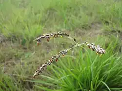 This plant typically reaches 20–150 centimetres (8–59 in) tall, growing from a short, white rhizome.[2] The leaf blades are typically 10–50 cm (4–19+1⁄2 in) long and 1–10 millimetres (1⁄16–3⁄8 in) wide. The plant produces 2-flowered fertile spikelets.[3]