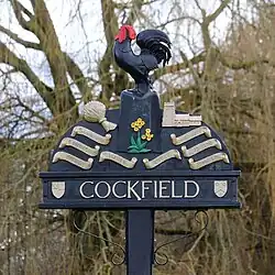 The name "Cockfield" is derived from the Old English "Cohha's open land", Cohha presumably being one of the first residents of the settlement.[2] The village appeared in the Domesday Book of 1086 under the name of "Cothefelda" and is listed as a prosperous manor whose wealth had grown since the Norman Conquest. During the Middle Ages, the village became "Cokefield" and finally "Cockfield".