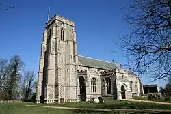 The church's sizeable square flint tower dates from the 14th century and is buttressed almost to the top. The tower was nearly destroyed by a storm during the winter of 1774-5 and on August 2, 1775, after repairs were nearly completed, an apparent lightning strike resulted in a fire that damaged it once again. The mathematician William Ludlam, rector from 1767, installed an astronomical observatory on the tower whose filled in windows can still be seen.[7]