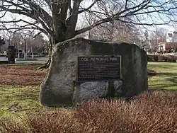 A great drama was made of the selection of a boulder upon which to place the memorial plaque for the Coes. The selected boulder weighed 15 tons and was moved through the center of town to the Park on the logging wagon pulled by twenty horses. The Civil War monument was originally erected in front of Town Hall in 1879 and was moved to Coe Memorial Park in 1936.