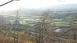The underlying rocks of Coed-y-Caerau are part of the Brownstone Formation of Old Red Sandstone which forms the crest of a ridge, Kemys Craig, running from south-west to north-east overlooking the River Usk to the north-west. After leaving the Old Roman Road, Coed-y-Caeru Lane follows the line of the ridge north-east for about 2700m towards Wentwood (Welsh: Coed Gwent). Some sources label Pen-toppen Ash (191m above sea-level) as a 'peak'[7] however Ordnance Survey and other maps clearly show the local high point in Coed-y-Caerau Woods at over 210m with higher elevations to the northeast.[1][2][8]