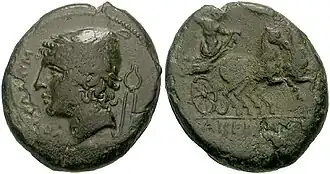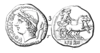 Cities share not only types but also coins and some identifying marks, such as the recurring acronym ΙΣ.[10] The symbols used to distinguish individual issues also tend to overlap, at least for cities with a more conspicuous number of issues. The symbols used also largely overlap with those of the coins of Neapolis and Rome.[11][12]