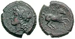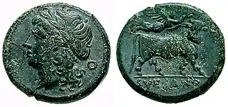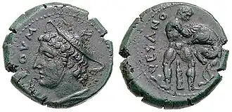 Three main groups of bronze coins were minted in Suessa: the one with Minerva/Gallus, the one with Apollo/man-headed bull, and the one with Mercury's head on the obverse and Hercules strangling the lion on the reverse.[28] The first two types are in common with many other cities in the area. The last type, with the head of Mercury (or Hermes) on the obverse and Hercules (or Heracles) on the reverse, is specific to Suessa.