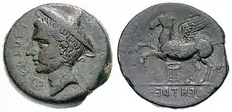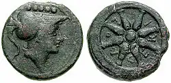 In the period between the First and Second Punic Wars, new coins with similar characteristics appeared in a group of cities linked to Rome.[5] These were bronze coins presenting two types: