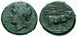 The cities share not only types but also coins and some identifying marks, such as the recurring acronym ΙΣ.[5] The symbols used to distinguish individual issues also tend to overlap, at least for cities with a more conspicuous number of issues. The symbols used also largely overlap with those of the coeval coins of Neapolis and Rome.[23][24]