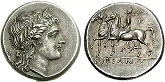 The coins of Suessa are closely related to those of other cities in the area in style, types, and production techniques;[28] silver coins with the types of Apollo on the obverse and Dioscurus on the reverse and bronze coins with three different types were minted in the city of Aurunci.[28][29]