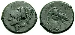 The obverse depicted the head of Apollo with a laurel wreath; the head could be turned to the right (Sambon 852-867 bis) or to the left (Sambon 868-869). Behind is a variable symbol. Sambon lists several of them: lyre, triskelion, crescent, tip of trident, sword, pentagon, shield, Phrygian helmet, owl, lion's snout, tripod, spearhead (or leaf), trophy, thunderbolt, eight-rayed star, wing, shell (of pecten), two-handled vase (or cantharus), helmet.[24][31] According to Head[29] the obverse is apparently copied from the Croton staters of the 4th century BCE.[32]