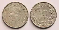 | Obverse: Head of Mustafa Kemal Atatürk with "TÜRKİYE CUMHURİYETİ" lettering (Republic of Turkey | Reverse: Face value and year within wreath, crescent moon and star at the top. Crescent opens right |