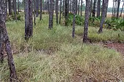 This grass grows in seepage bogs on the Lake Wales Ridge and other ridges in central Florida, an area of high plant endemism. It occurs on moist slopes that receive moisture from areas at higher elevation. It may be found near ponds in Florida scrub, or scrubby habitat, and in marshy flatwoods.[1] Cutthroat grass communities are heavily dominated by the cutthroat grass species. They occur in a number of habitat types, but all are dependent on wildfire for their natural maintenance. Fire keeps the open grassland free of large and woody vegetation. The most distinctive cutthroat grass community is the cutthroat seepage slope, a range of microhabitat types defined by elevation and the water table.[3]