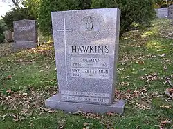 It was shortly after this busy period that Hawkins fell into the grip of depression and heavy drinking and his recording output began to wane.[6] His last recording was in 1967; Hawkins died of liver disease on May 19, 1969,[6] at Wickersham Hospital, in Manhattan. He was survived by his widow, Dolores, who died in 2010, and by three children: a son, Rene, and two daughters, Colette and Mimi.[22] Hawkins is interred in the Yew Plot at the Woodlawn Cemetery in The Bronx, New York City.[1]