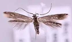 The wingspan is 8–10 mm (0.31–0.39 in).[2] The head is shining dark bronzy-fuscous, and the antennae are dark fuscous; apical half white with dark fuscous rings, indistinct towards apex. The forewings are dark bronzy-fuscous, and the hindwings are dark grey.[3][4]