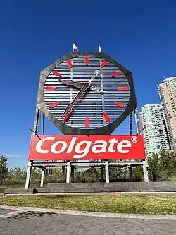 The Colgate Clock is an octagonal clock facing the Hudson River near Exchange Place in Jersey City, New Jersey. The clock has a diameter of 50 feet (15 m).[1] It was located atop of what was once the headquarters of the Colgate-Palmolive, until 1985, when it was moved to a ground-level location 1,300 feet (400 m) south of that building, which was demolished and replaced with the Goldman Sachs Tower.
