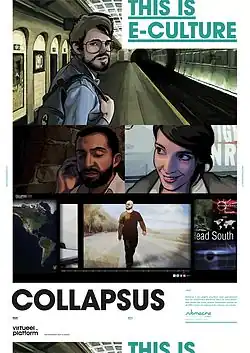 Collapsus is a project that combines animation, interactive fiction, and documentary film.[1] This story follows how the impending energy crisis affects ten young people, while international powers battle with political dissension and a fearful population during transition from Fossil fuel to alternative fuels.[1] Set in the near future, Collapsus was initialized to raise awareness of the global issue of peak oil.