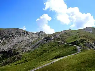 It connects the Valle Grana, which ends here, with the Vallone dell'Arma (a lateral of the Valle Stura di Demonte).[2] The name Colle dei Morti stems from fierce fighting which occurred nearby during the 18th century between Franco-Spanish and Piedmontese troops.[3]