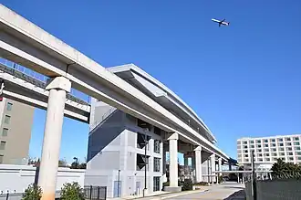 In the 1970s and 1980s, large swaths of property in College Park were purchased using information detailed in The Hartsfield-Jackson Atlanta International Airport Noise Land Reuse Plan, which allowed the airport to apply for federal funding to purchase property deemed to be in so-called "noise land."[12][13] The 1985 Chuck Norris film Invasion U.S.A. was notoriously filmed in these abandoned portions of College Park; houses owned by the City of Atlanta and the FAA were allowed to be blown up to simulate bazooka attacks, a decision that has faced modern day criticism due to the fact that nearby properties were still in the process of being purchased.[14][13] This site would eventually, in 2003, in part be home to the Georgia International Convention Center; the center officially opened in 1985 at a separate location, but was relocated to the area in response to planned airport runway expansions.[15] Today, the GICC is the second largest convention center in Georgia, featuring a carpeted ballroom and multiple spaces for meetings, conferences and conventions. It is the only convention center in the country that also houses a SkyTrain with direct rail access to an international airport. Directly next to the Georgia International Convention Center is the Gateway Center Arena, which opened in November 2019, home to the NBA's G-League College Park Skyhawks and where the WNBA's Atlanta Dream will play their 2020 season.[16]