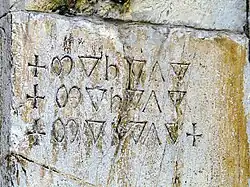 The church was built with white marble from the quarries near the town, and sited on a hilltop acropolis. The west front is a square wall with a castle-like bell-tower. The main Romanesque portal has two semi-columns with carved lion capitals; above is an arch and decorations with leaf motifs. One façade block has a repeated inscription - a prayer to the Archangel Michael. The characters are also seen in a block in the Baptistry opposite the Duomo of Pisa as well as other churches in Tuscany. The church has a central nave, and two lateral aisles. It contains some 12th- or 13th-century fonts, one with a carving depicting John the Baptist.