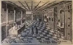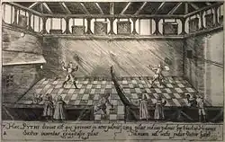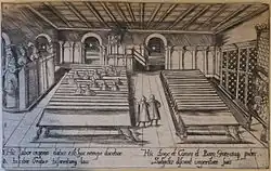 The arcades and the spacious gallery courtyard were used for various events. The training in the courtyard could be watched from the floors. In the south western part of the building there was a Jeu de paume court, where the aristocrats could play.[4] As with Tennis a net was stretched across the room. At one side the net joined a gallery, which had a pent roof that was part of the court. From the gallery and the windows, spectator could watch the game.