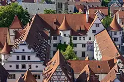 Duke Christoph, who was a deeply religious Lutheran, wanted to expand the court school to an academy. Therefore, he instructed his court architect Georg Beer to erect a four-wing complex in the style of late renaissance between 1588–1592. The portal is at the corner of the streets Lange Gasse and Collegiumgasse. Above the portal, there is still the coat of arms of the Duchy of Württemberg from the year 1593. As Duke Christoph died in 1568, and his son Louis III, Duke of Württemberg died in 1593 childless, Frederick, Count of Mömpelgard - a branch of the House of Württemberg - became duke in 1593 and therefore opened the Collegium illustre on April 25, 1594.[1] The first collegians were admitted on that day. Under the statutes of April 23, 1594 aristocrats, as well as bourgeois, could attend the academy.[2]