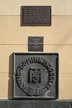 On 3 June 1873 the Rev. C. S. Perry suggested that the Collingwood Lunatic Asylum should be secured for State School purposes. This proposal met with approval and on 16 June 1873 the last of the asylum inmates were transferred to Kew and the Collingwood site was officially made available to the Education Department as of 17 June.[6] As with the two previous establishments on the site, the school was to have been a temporary measure until a North Fitzroy school was completed; a temporary measure which continues to this day. The school buildings were in a poor state of repair, and the majority were replaced by the existing school buildings in 1878. In 1879 the school changed its name to Lee Street State School. Only two buildings survived into the twentieth century – the Governors House and Prisoner's mess. The Prisoner's Mess was one of the earliest buildings of the stockade. Constructed out of timber and iron, it was used as the school's shelter shed until the 1920s when it was demolished. The Governors House later became the school principal's residence and was also demolished in 1913 after it had fallen into a state of disrepair.[3] The present day school has a bluestone slab thought to have been part of the Governor's House which reads H.M.S. (Her Majesty's Stockade) T.M.S. (Thomas Malcolm Smith, the first Governor).