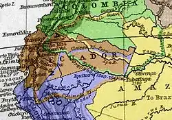 The Colombian–Peruvian dispute traces its origins after the end of the independence struggles in Spanish America.[5] Despite the initial negotiations between the two countries, the fall of Great Colombia and the turbulent political climate that followed prevented the delimitation of the border.[6][7][8]