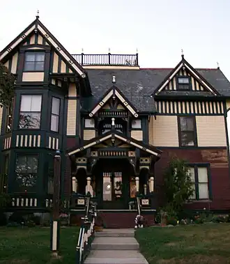 Taylor's house mixes two related architectural styles, the Queen Anne and the Stick-Eastlake.[1] Built of wood on a stone foundation, the house is topped with a two-part roof: some is slate-covered, while the rest is protected by asphalt. The two-and-a-half-story facade is composed of three distinctive sections: the middle, comprising an elaborate porch with projecting eaves and a smaller sheltered pair of windows on the second story; a plain right side (as seen from the street) with flat walls, a third-floor gable, and a simple window in each story; and a three-story left side dominated by a large bay window on the first and second stories and a prominent overhang on the third. The entire building is covered with a multi-part gabled roof.[4]