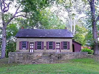 It is six bays wide and one room deep, and measures 36 feet by 22 feet, in the traditional plan with separate entrances for the men and women and a sliding divider to separate the interior into two areas for business meetings. Its walls are constructed of 18-inch-thick (460 mm) stuccoed fieldstone, with a wooden box cornice. The building features two interior end chimneys protruding through a slate roof. The property includes a small cemetery and a two-story building built in 1869, and used as a Friends schoolhouse until 1890 when public schools were built.[3]