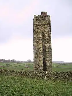 Visible from Roundhill Reservoir and Leighton Reservoir above Arnagill Crags is a stone sighting tower built over an aqueduct near a water-pumping station.[2] The similar Carle Tower is 1.9 miles (3 km) southeast just above Wandley Gill,[3] Carlesmoor Sighting Tower is a further 1.2 miles (2 km) east[4] and another sighting tower to the north is long since gone, having been constructed of wood. The Greygarth Monument is also in the area,[5] commemorating Queen Victoria's Diamond Jubilee in 1897.