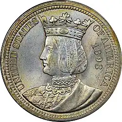 The Isabella quarter or Columbian Exposition quarter was a United States commemorative coin struck in 1893. Congress authorized the piece at the request of the Board of Lady Managers of the World's Columbian Exposition. The quarter depicts the Spanish queen Isabella I of Castile, who sponsored Columbus's voyages to the New World. It was designed by Bureau of the Mint Chief Engraver Charles E. Barber, and is the only U.S. commemorative of that denomination that was not intended for circulation.